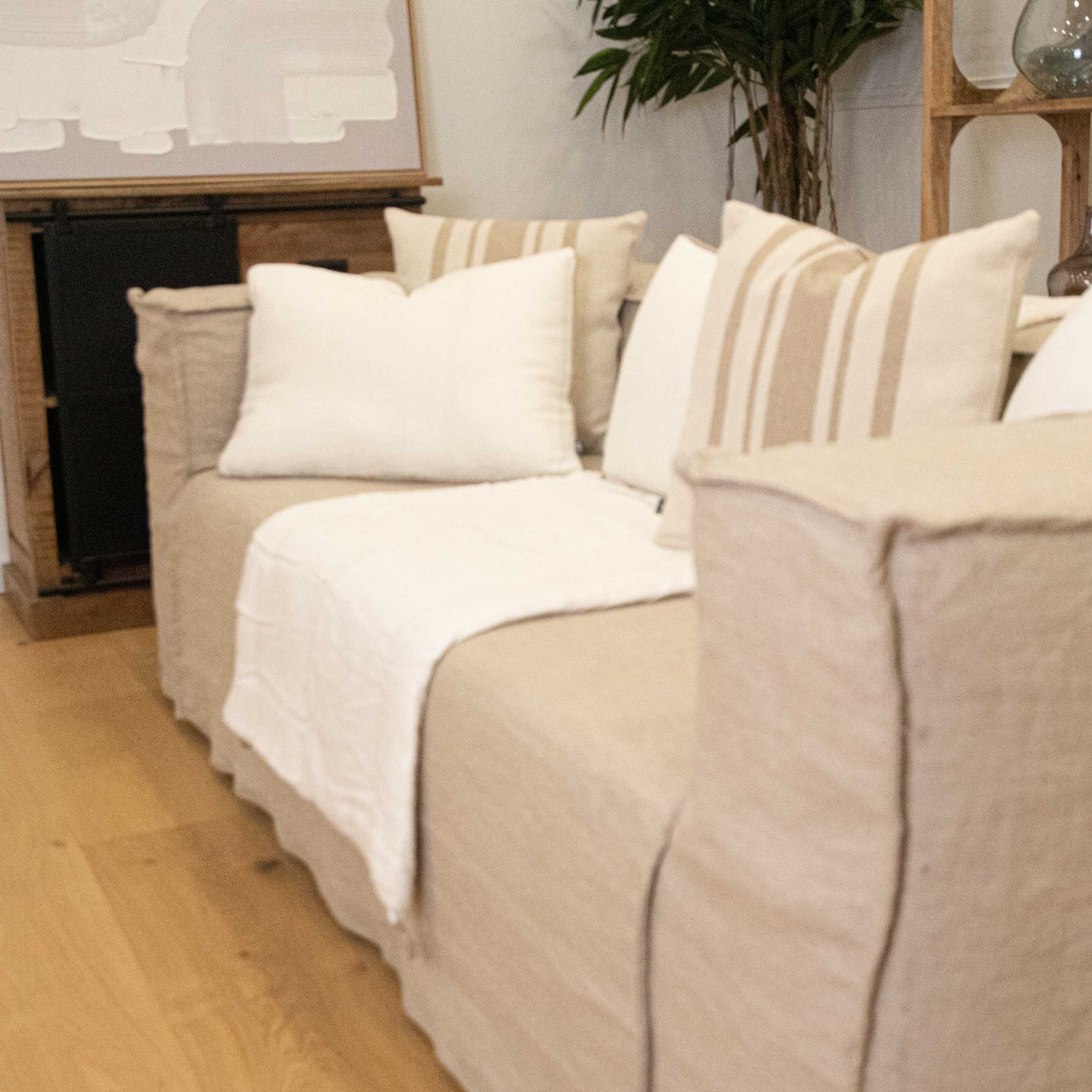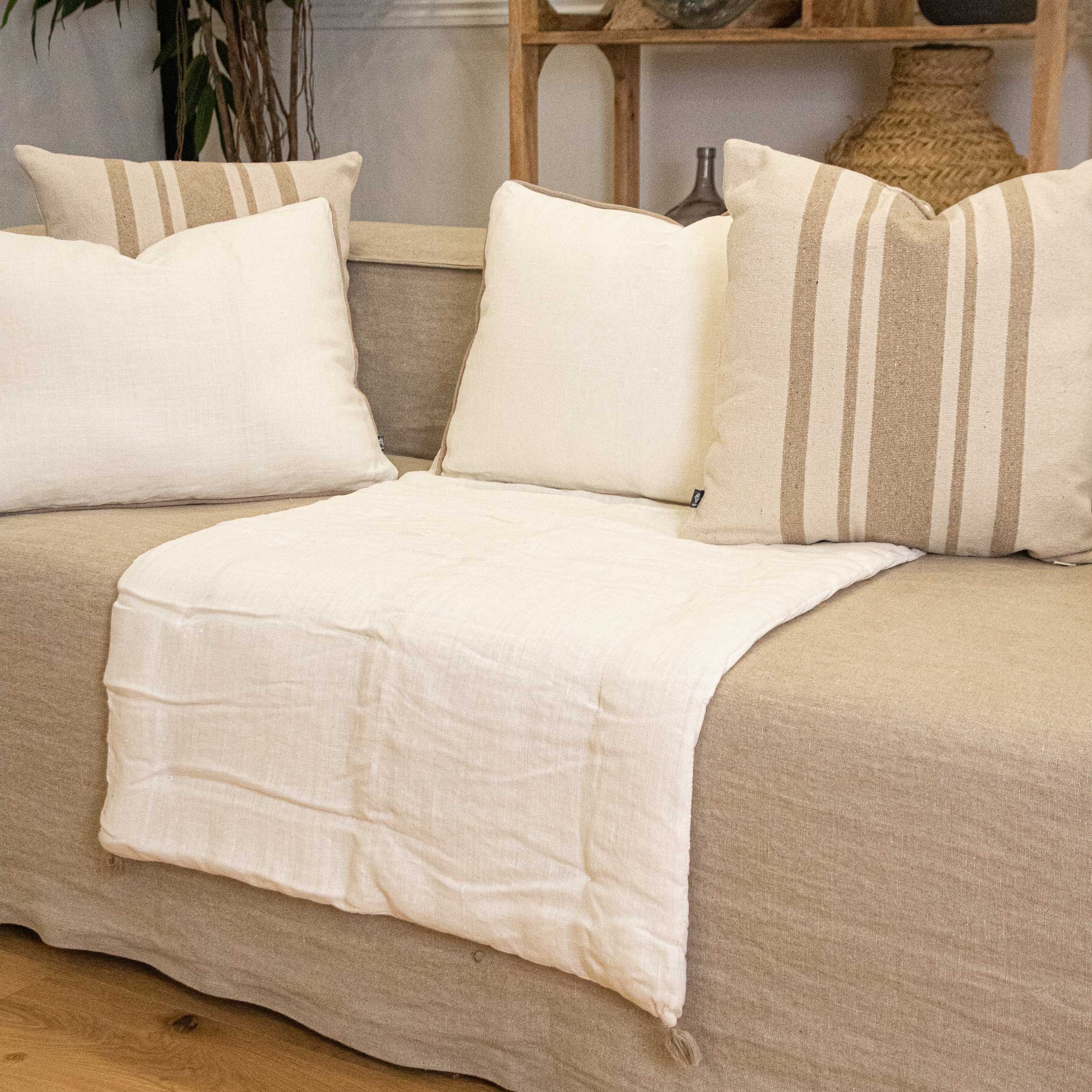 Coussin réversible 1 face en lin lavé et l'autre face en coton couleur blanc et l'édredon 100% lin lavé avec ces minis franges.