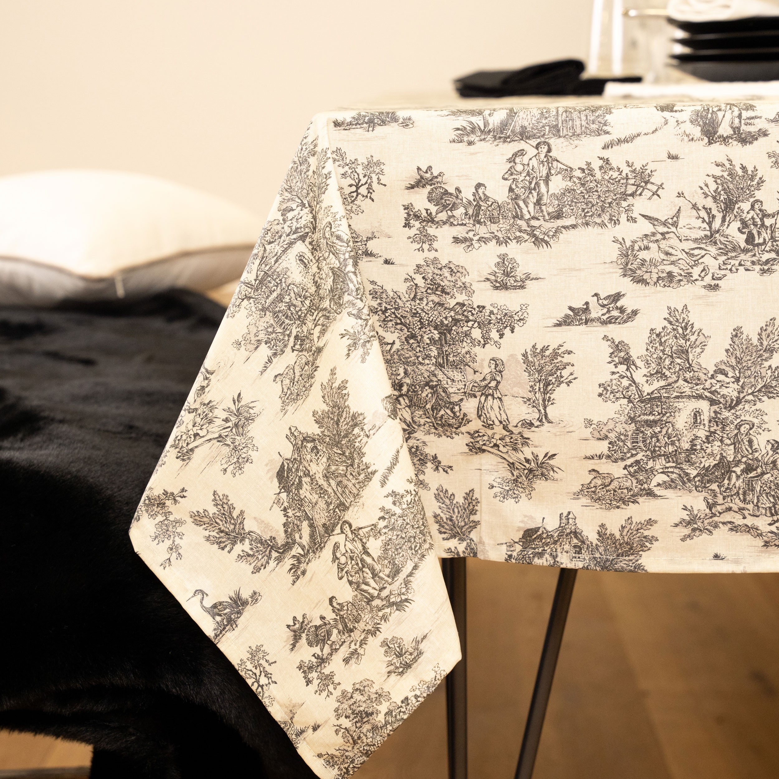 Nappe enduite imprimé d'une belle TOILE DE JOUY un esprit vieille FRANCE qui pourra s'accorder dans un environement moderne aussi bien que dans un vieux mas. Le support est 100% coton. Le traitement DOUBLE ENDUCTION ainsi que la confection sont MADE IN F