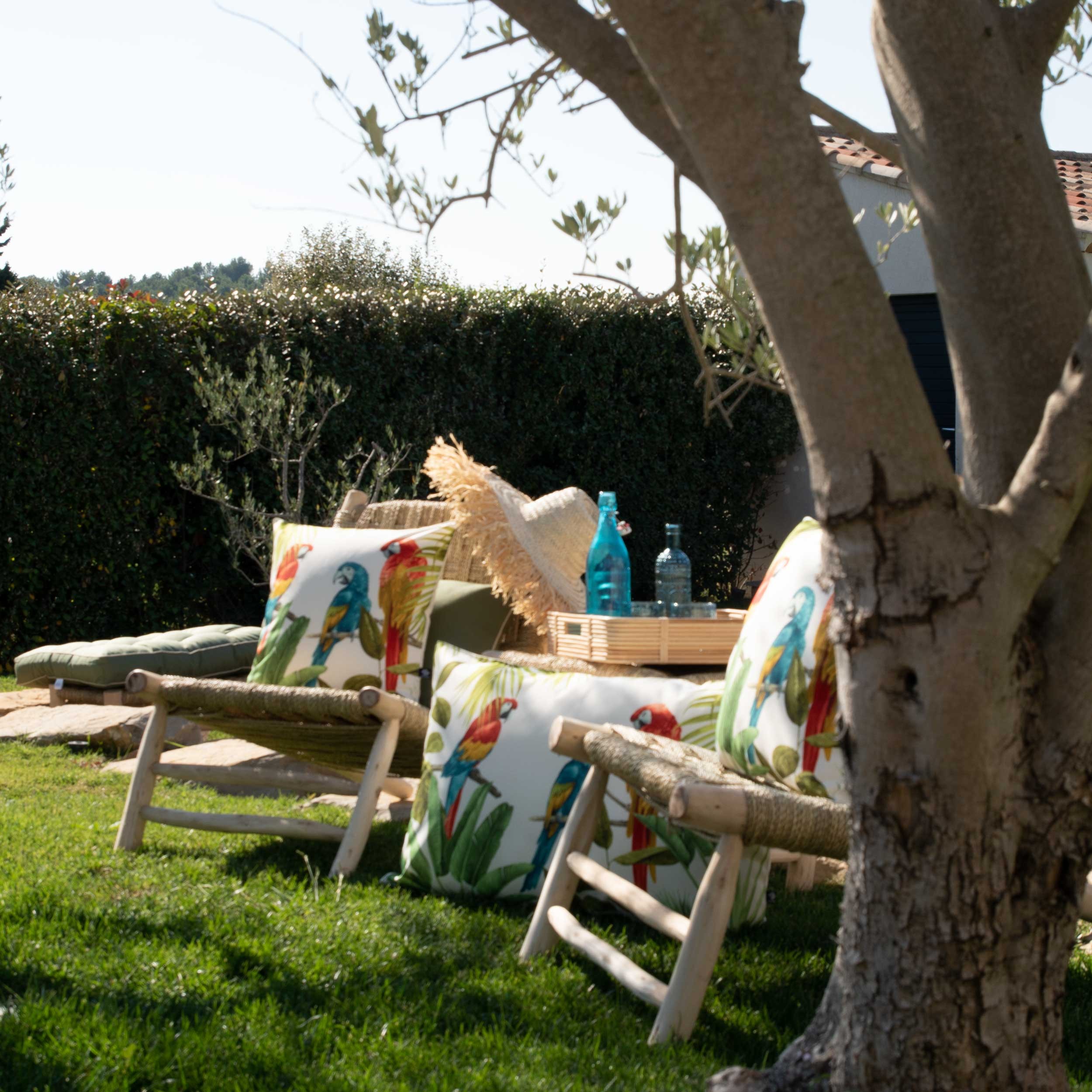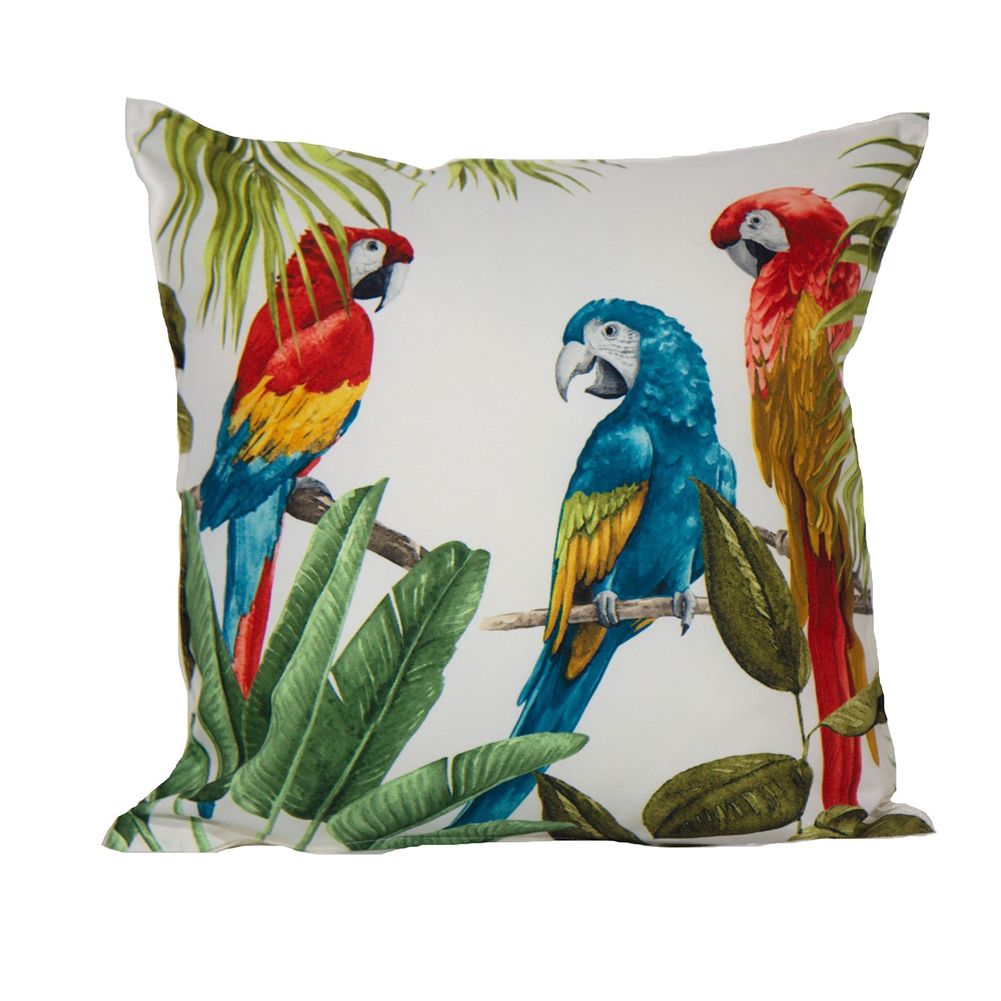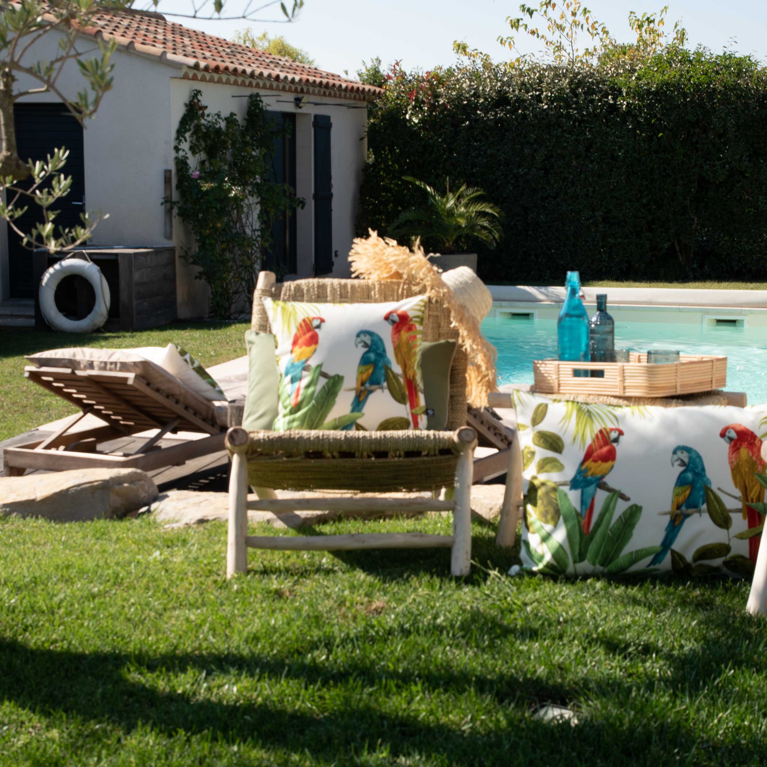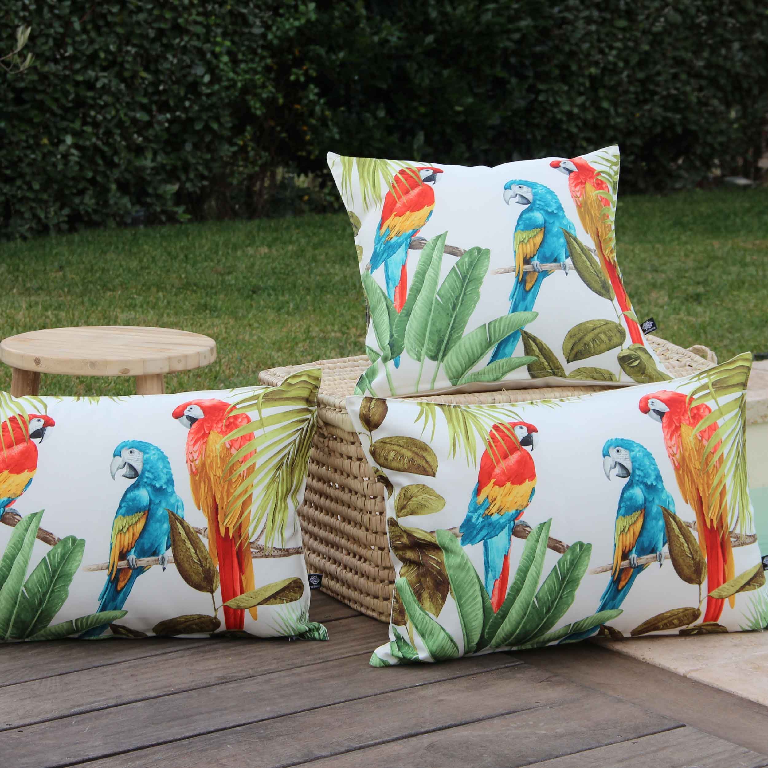 Ce magnifique perroquet imprimé sur une collection outdoor de coussins et pouf en 100% polyester son filtre anti UV permet de presérver les couleurs estivales de vos coussins, un tissu de 230 GSM finition double piqure, déhoussable, déperlant qui vous permet de les garder dehors tout l'été en toute sérénité. Durée de résistance aux UV de 300h maximum; au delà, le tissu peut commencer à s'abimer. Ce produit est disponible en plusieurs couleurs et dimensions