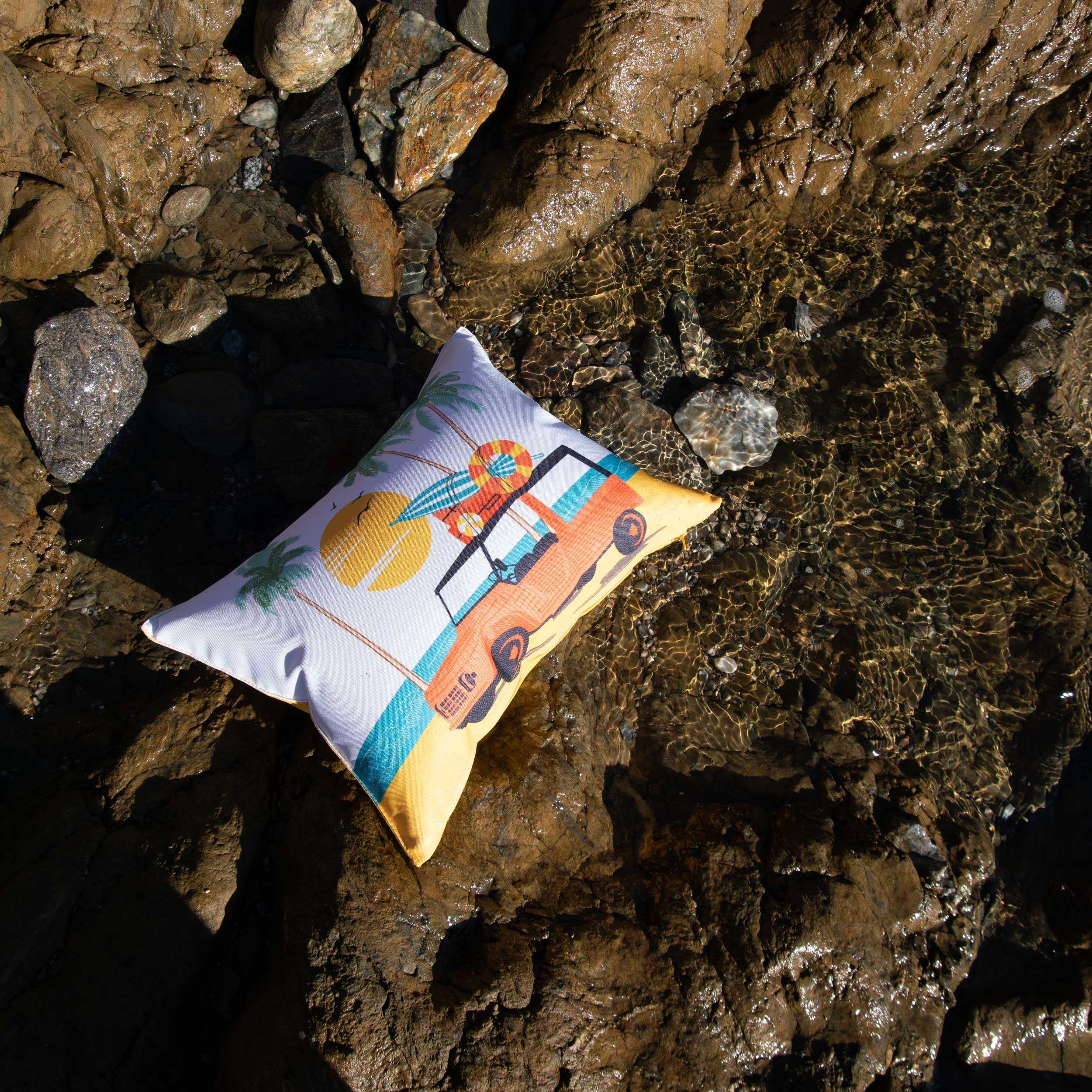 Matelas de plage et ses coussins en tissu OUTDOOR. Le matelas de plage se roule et peut se transporter avec une poignée sa tete est gonglable en formant un coussin pratique sur les galets. Un petit coussin de plage gonflable lui aussi en 40x30 sans oubli