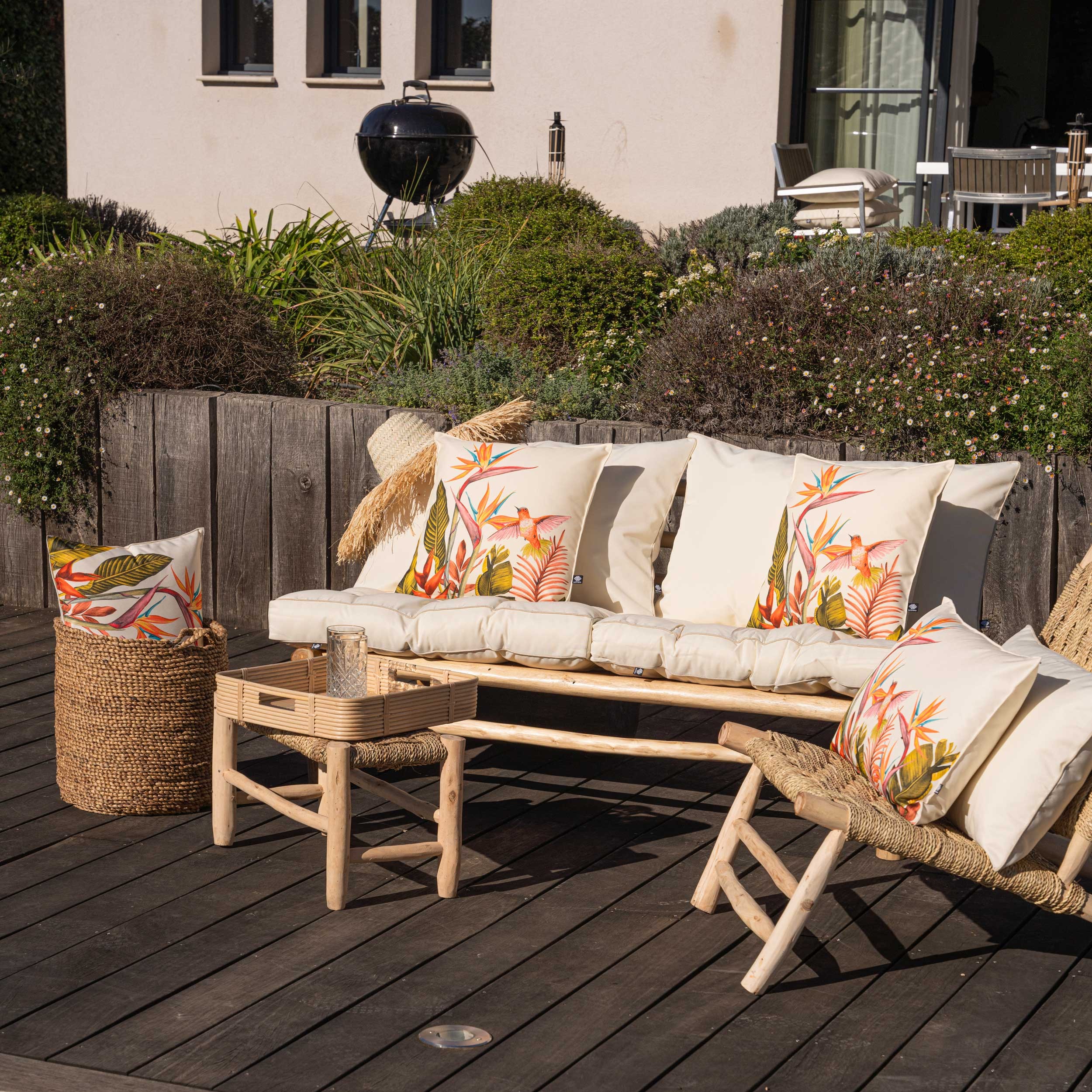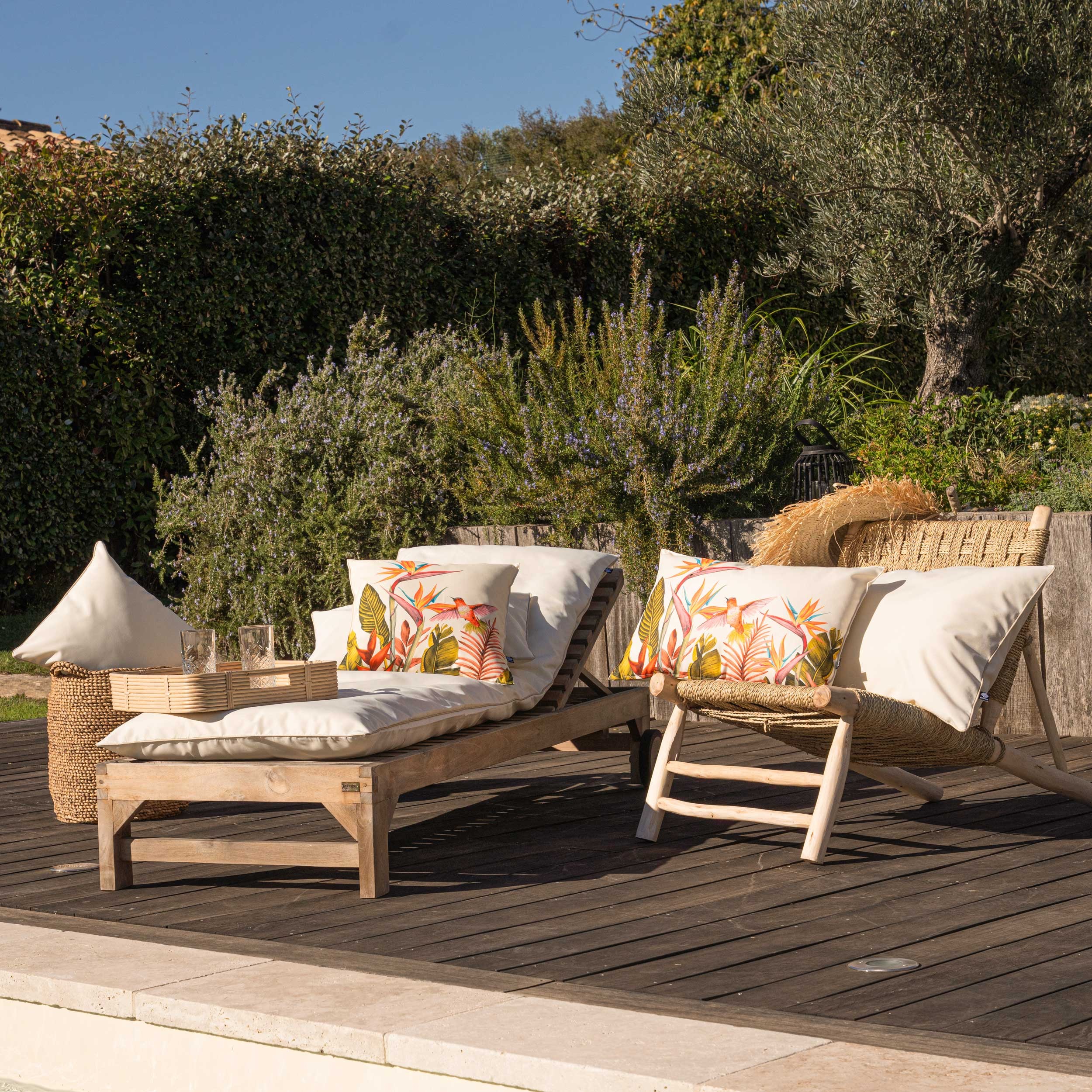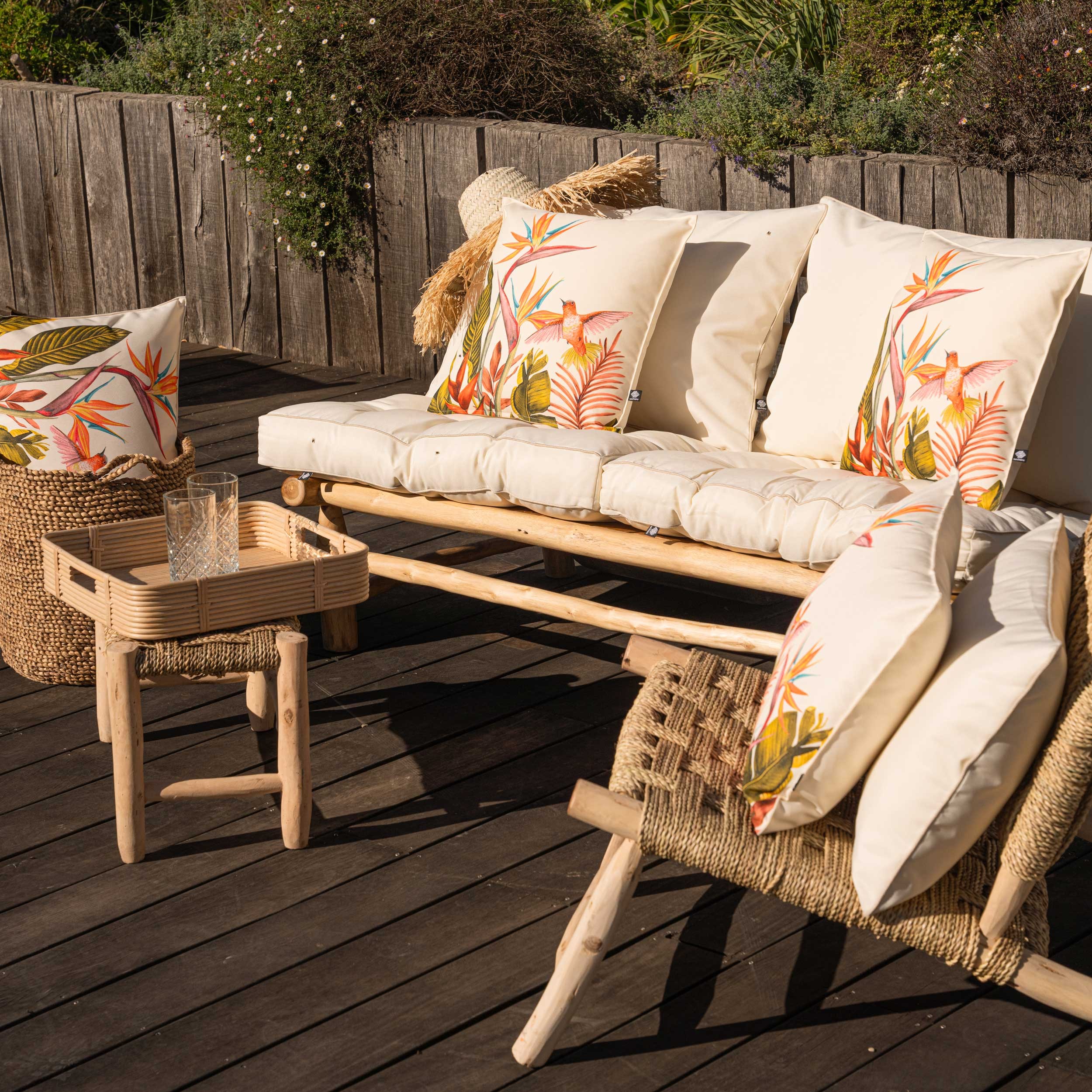Apportez une note d’exotisme à votre terrasse avec nos coussins extérieurs au motif Oiseau de paradis.