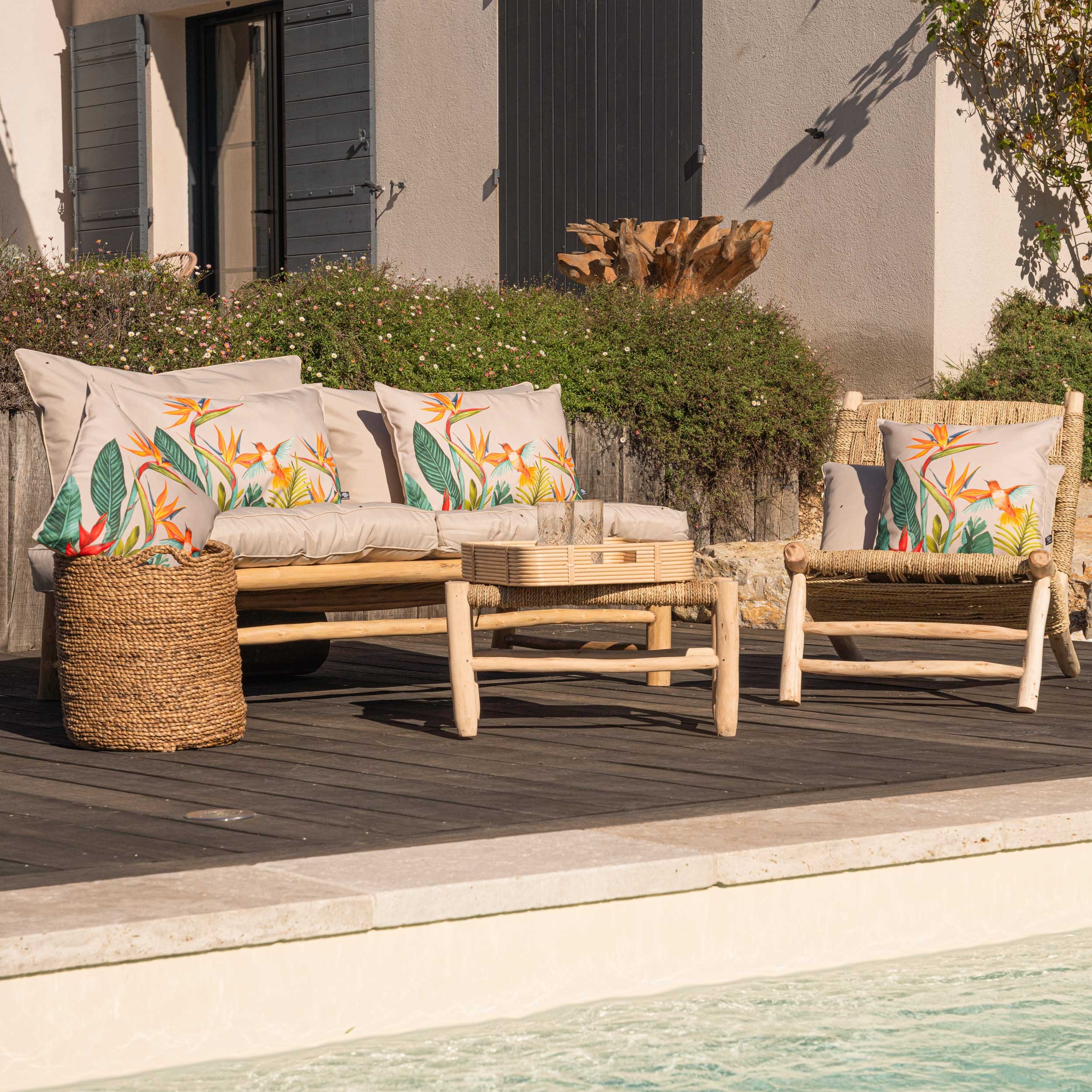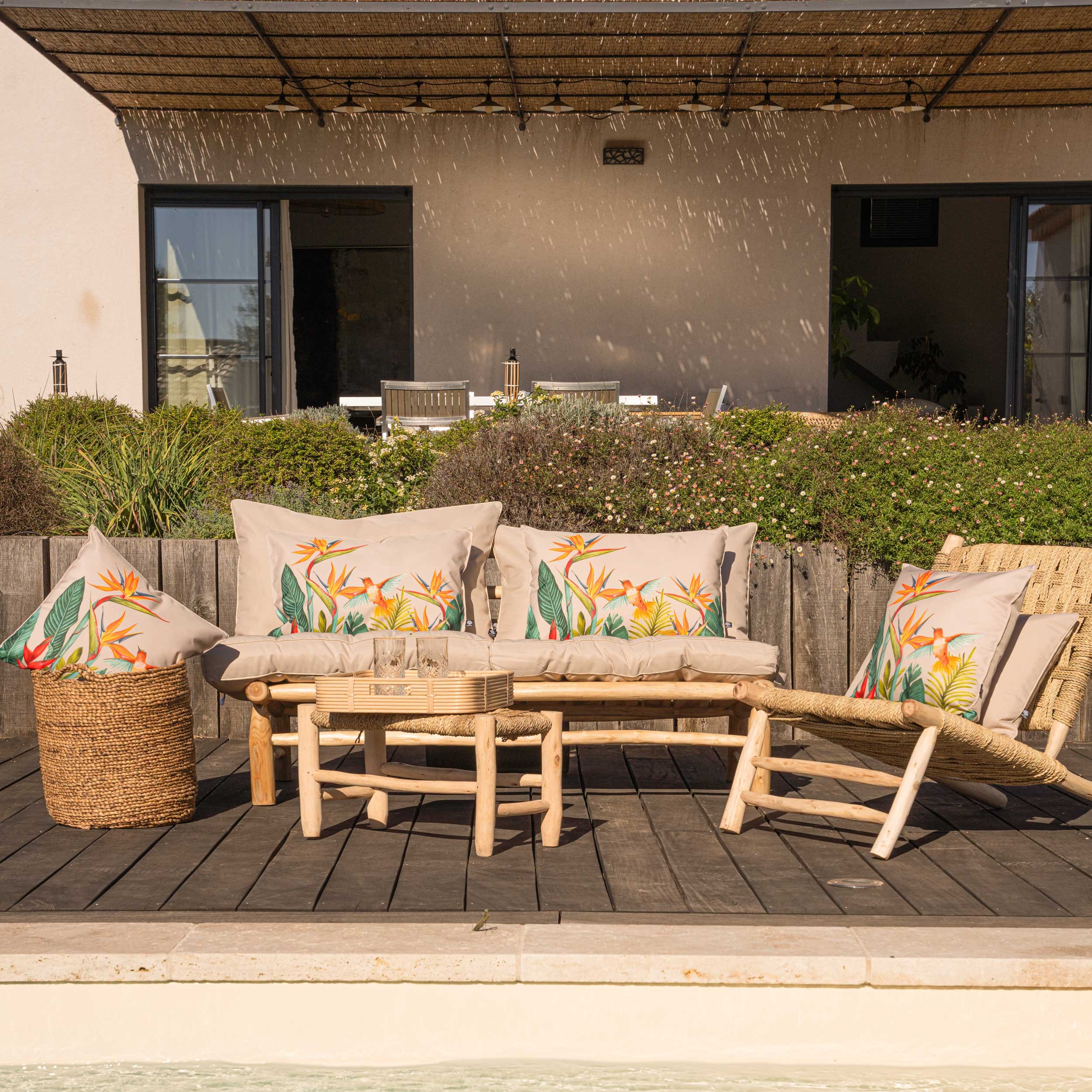 Apportez une note d’exotisme à votre terrasse avec nos coussins extérieurs au motif Oiseau de paradis.