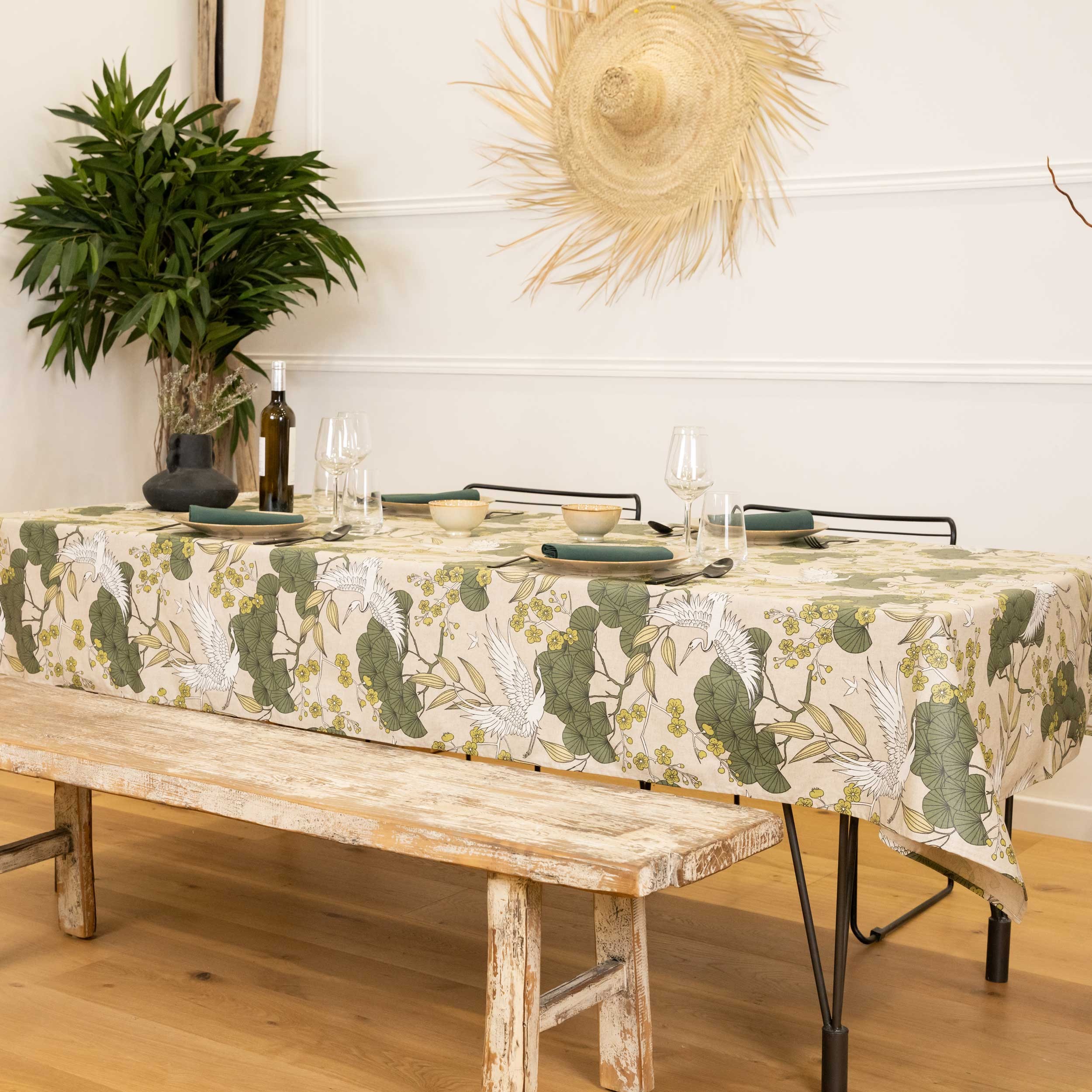 Apportez une touche d’élégance à votre table avec cette nappe en tissu enduit anti-tache aux motifs japonisants. Son design raffiné, inspiré des estampes nippones, mêle délicatement nature et géométrie. Grâce à son traitement déperlant, elle résiste aux